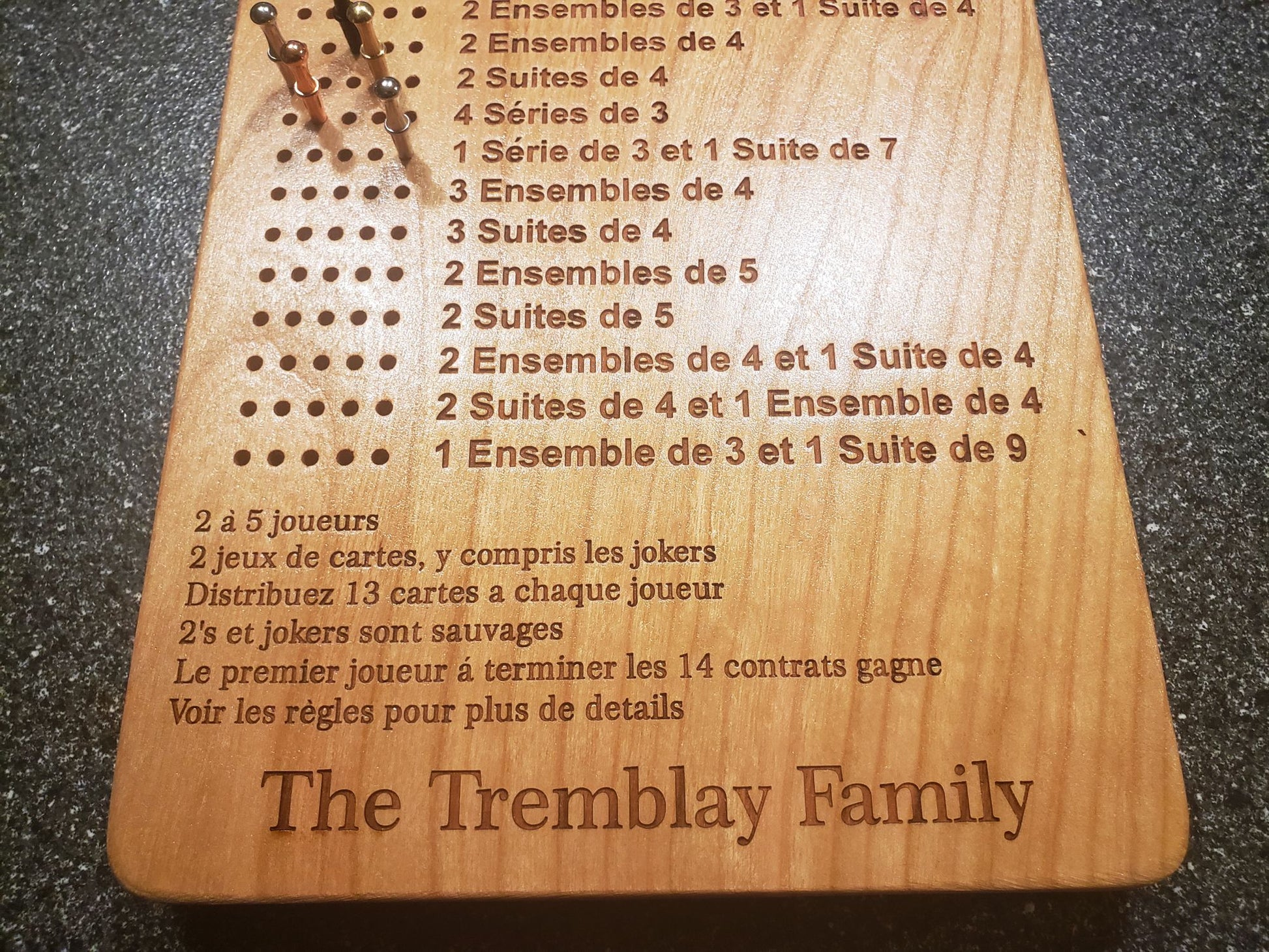Transform your Frustration Rummy game nights with the original handcrafted scoreboard that's been trusted by players for over 16 years. No more paper scorecards or arguments about who's winning - this beautiful cherry wood board keeps everyone on track through all 14 contracts.